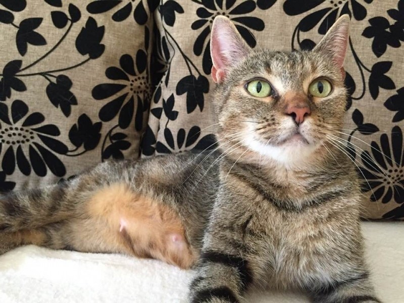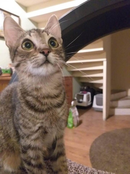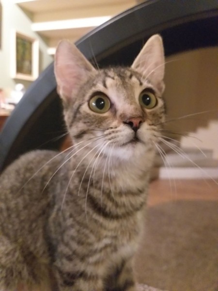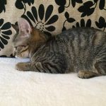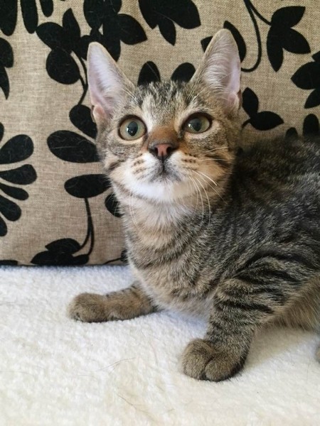 Egy nagyon fiatal anyacica öt picikéje közül volt ő az egyik, a legkisebb királyfi. Nem fogadtunk volna rá komolyabb összegben, hogy életben marad, de végül akkora élni akarás volt ebben az aprócska testben, hogy ő lett az egyetlen túlélő.  Több hetet töltött állatkórházban bejárósként, amennyi infúzió lecsorgott neki… ahány órát tápláltuk fecskendővel… amennyi időt a kórház ápolóinak zsebében töltött… Mert Gyuszkót mindenki imádja, van benne valami megmagyarázhatatlan, tud valamit. 🙂 Mire túl lett a betegsége nehezén körvonalazódott, hogy valami fejlődési rendellenessége van (kisagyi hypoplasia) ami mozgáskoordinációs problémában nyilvánul meg nála, járása kicsit dülöngélős, néha csak úgy elborul. Őt ez semmiben nem gátolja meg egész nap játszik, eszik, alszik, ahogy a többi cica.