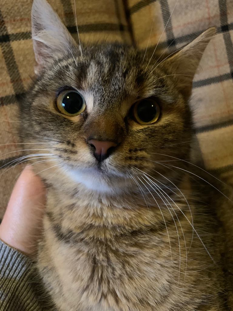 Gyönyörűséges és szuper kedves cicuska ő, az átélt borzalmak kicsit bizalmatlanná tették, de néhány perc simogatás után már boldogan dorombol a kanapén.