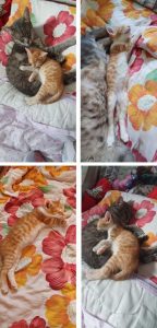 Teódika hatalmasat fejlődött az elmúlt hetekben, az emberek felé egyre nagyobb bizalommal van, már mindenkinek dorombol és a simogatást is engedi. Imádja a kicsi cicusokat figyelni, de nem bántja őket, csak mint egy igazi főnök ül a szoba közepén és mindent szemmel tart. 😀