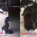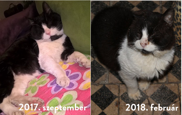 Szilveszter cica a szatymazi “horror tanyáról” menkült, az egyik a 4 cica közül, akiket magunkhoz vettünk. Ő van a legrosszabb állapotban, számtalan élősködővel küzdött mikor hozzánk került, és a szőre valami elképesztő állapotban volt/van, olyan súlyosan fertőzött volt bolhákkal, hogy sok helyen teljesen kirágta a szőrét. A híradásainkból az egykori gazdi felismerte, és küldött róla képeket. Kijárós cica volt Szilveszter (eredeti nevén Marci) és noha sokáig minden nap szépen hazajárt egyszer csak eltűnt. Hogy mi történt talán már soha nem derül ki, de most, 6 hónappal később ez a hajdani délceg, gyönyörű kandúr ilyen állapotban van.