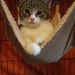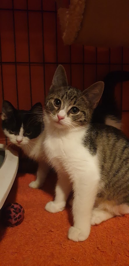 Totya nagyon barátságos, és igen társaságkedvelő, ő az első aki tülekedik a ketrecük ajtajánál a simiért, és ha épp nem az ő hab testét imádja valaki, akkor nem restelli magát mandínerből simiztetni, bebújik a karod alá, hogy neki is jusson a figyelemből. Nagyon pihe-puha bársonyos a szőre, a hátsó lábain pedig cuki kis “cirmos térdvédők” vannak a hófehér bundáján. Amíg takarítom a ketrecüket a hordozóban várják, hogy visszamehessenek, de Totya ott sem nyugszik, addig nyújtogatja a mancsát, amíg el nem éri a lábamat. ![]()