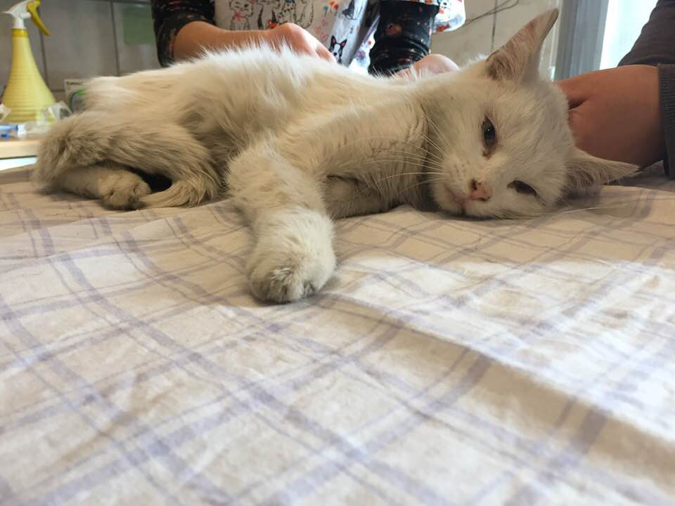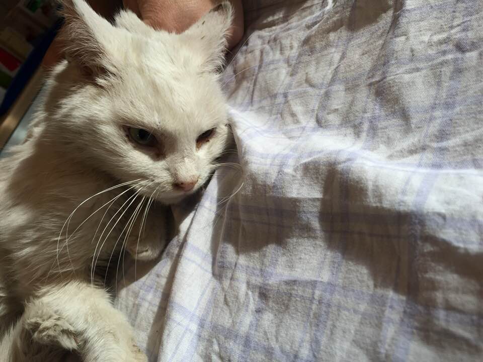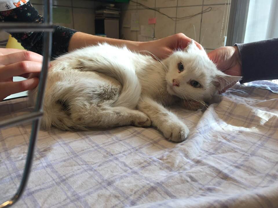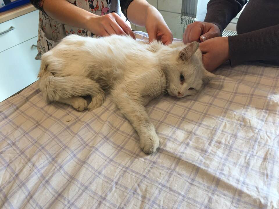 Nagy nehezen sikerült bezárni őt és egy kis társát a pincébe, ahol pár nap után végre a csapdába is hajlandó volt belemenni. Első utunk az állatorvoshoz vezetett vele, ahol magas lázat mértek nála, és a széklete vízszerűen távozott belőle. Ez a 3-4 éves cica mindössze 1,7 kg-ot nyomott, a felét annak, amilyen súlyban kellene lennie. Megkezdődött a kezelése, kapott infúziót, és minden jóval felturbózott 4-5 injekciót. A rendelőben azért még utolsó erejéből kitépte magát az infúzióból, és még arról is gondoskodott, hogy a rendelő a 2018-as évben is nagyon-nagyon szerencsés legyen. Elég az hozzá, hogy a látogatást felmosónyéllel a kezünkben zártuk, nem volt képünk úgy ott hagyni a doktornőt.