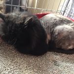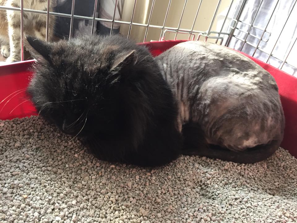 Krampusz egy 2-3 éves gyönyörűséges perzsa mix kandúr, akit iszonyatos állapotban fogtunk be Gödöllőn. A gazdái sorsára hagyták, egy lakatlan házban élt, a környékbeliek jóindulatára utaltan, ők kértek számára segítséget, mikor látták, hogy egyre nehezebben mozog és él. Ennek a hajdan délceg kandúrnak a bundája teljesen összerasztásodott, sok helyen kitépve a szőrét, deréktól lefelé pedig teljesen a bőrére volt tapadva, nehezen mozgott, nem tudott tisztálkodni. Olyan mértékű volt a probléma, hogy lehetetlen volt kibontani a csomókat, így az ivartalanítás napjára egyeztettünk egy kozmetikussal. Miután sajnos a kozmetikusnak közbejött valami nem volt mit tenni… mi estünk neki, hogy ne kelljen szükségtelenül többet altatni. A végeredmény nem lett szépségdíjas, de nagyon megkönnyebbült a cica – bár most eléggé utál minket – könnyebben tisztálkodik, és mostantól kordában tudjuk tartani a szőrét is. Úgy volt, hogy ivartalanítás után visszahelyezzük, azonban így, hogy deréktól lefelé csupasz lett nem tehetjük vissza, keresünk számára egy álomgazdit.